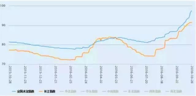 最近一年全國水泥價格指數(shù)(藍(lán)色線)和長江指數(shù)(紅色線)走勢