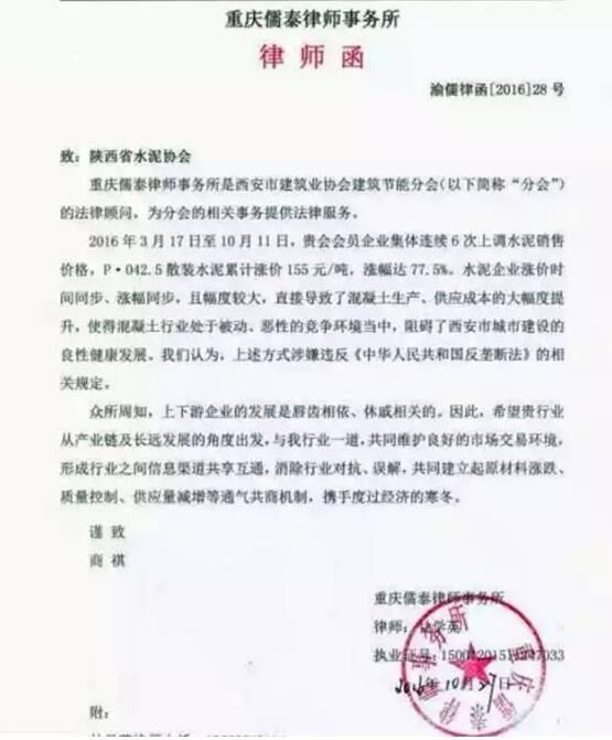 10月27日,鑒于陜西省內(nèi)水泥市場及混凝土市場發(fā)展情況,西安市建筑業(yè)協(xié)會建筑節(jié)能分會認(rèn)為這一市場情況違法了《中華人民共和國反壟斷法》的相關(guān)規(guī)定,并向陜西省水泥協(xié)會發(fā)律師函。希望水泥行業(yè)從產(chǎn)業(yè)鏈及長遠(yuǎn)發(fā)展的角度出發(fā),與混凝土行業(yè)一道,共同維護良好的市場交易環(huán)境,形成行業(yè)之間信息渠道共享互通,消除行業(yè)對抗、誤解,共同建立起原材料漲跌,質(zhì)量控制、供應(yīng)量減增等通氣共商機制,攜手度過經(jīng)濟寒冬。