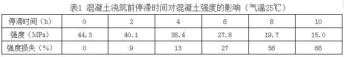 (6)在初凝時(shí)間內(nèi)的混凝土,由于氣溫較高、運(yùn)距較遠(yuǎn)、壓車時(shí)間較長等造成混凝土坍落度損失較大,可通過試驗(yàn)添加同型號的泵送劑或減水劑,但添加與原先已加的總和摻量不能超過外加劑最大摻量的20%。應(yīng)逐漸添加,先少加,摻入后,攪拌運(yùn)輸車必須快速轉(zhuǎn)動2min左右,測定坍落度符合要求。運(yùn)到現(xiàn)場的混凝土不能立即卸料,應(yīng)快速轉(zhuǎn)動運(yùn)輸車2min后卸料,以確保坍落度和質(zhì)量。對超過初凝時(shí)間的混凝土應(yīng)廢棄,不能再使用?;炷翝仓巴臅r(shí)間越長,混凝土強(qiáng)度損失越嚴(yán)重(如表1),應(yīng)當(dāng)引起足夠重視。