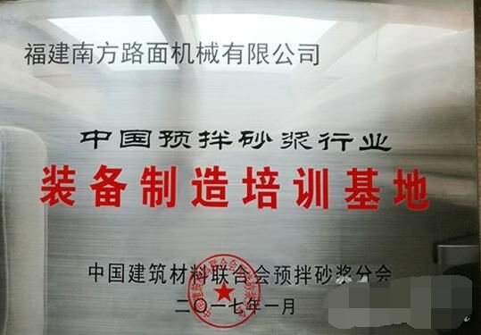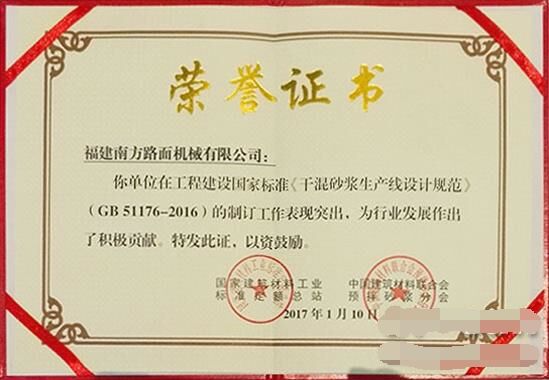 2017年1月10日,在2017'首屆中國(guó)國(guó)際預(yù)拌砂漿裝備技術(shù)研討會(huì)暨預(yù)拌砂漿綠色生產(chǎn)裝備及機(jī)械化施工技術(shù)峰會(huì)上,福建南方路面機(jī)械有限公司被中國(guó)建材聯(lián)合會(huì)預(yù)拌砂漿分會(huì)授予“中國(guó)預(yù)拌砂漿行業(yè)裝備制造培訓(xùn)基地”;同時(shí),因在國(guó)家標(biāo)準(zhǔn)GB51176-2016《干混砂漿生產(chǎn)線設(shè)計(jì)規(guī)范》編制工作中的特殊貢獻(xiàn),被授予“特別貢獻(xiàn)單位”。