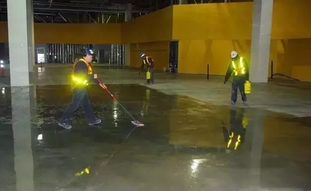 一旦混凝土表面的張合力被打開(kāi),混凝土經(jīng)過(guò)20到40多分鐘來(lái)吸收硬化劑。接著,可以對(duì)同一時(shí)間段進(jìn)行施工的整個(gè)區(qū)域做一個(gè)評(píng)估。如果大多數(shù)材料都已經(jīng)滲透到混凝土里,那就就將剩下的材料從濕潤(rùn)區(qū)域勻到干燥區(qū)域。在起粘稠區(qū)域處添加點(diǎn)水,把地面刷均勻,然后讓它自然干。如果材料已經(jīng)全部滲透進(jìn)去,表面沒(méi)有任何殘留物,那就不需要再清洗地面了。