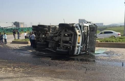 闖紅燈惹的禍?路口混凝土攪拌車與轎車相撞側翻