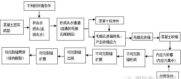作者在攪拌站成立之初的抗裂實(shí)踐中,對(duì)這些現(xiàn)象也深感困惑。直到后來明確了早期裂縫是因?yàn)榛炷潦^多所致,并對(duì)這一機(jī)理進(jìn)行了深入研究,才重新認(rèn)識(shí)了混凝土收縮裂縫形成的全過程,如圖1[5]所示。