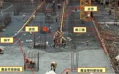 6、大體積泵送混凝土經(jīng)振搗后表面水泥漿較厚,容易引起表面裂縫。首先,要求在振搗最上一層混凝土?xí)r,控制振搗時(shí)間,注意避免表層產(chǎn)生太厚的浮漿層;在澆搗后,必須及時(shí)用2m 長(zhǎng)括尺,將多余浮漿層刮除,按照標(biāo)高控制點(diǎn),將混凝土表面括拍平整。有凹坑的部位必須用混凝土填平,在混凝土收漿接近初凝時(shí),混凝土面進(jìn)行二次抹光,用木蟹全面仔細(xì)打抹兩遍,既要確?;炷恋钠秸?,又要把其初期表面的收縮脫水細(xì)縫閉合,在混凝土收漿凝固施工期間,除了具體施工人員外,不得在未干硬的混凝土面上隨意行走,收漿工作完成的面必須同步及時(shí)覆蓋薄膜。
