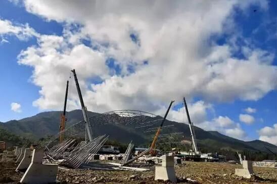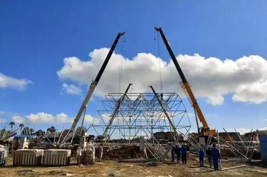 此項工程分兩期建設(shè),一期兩條生產(chǎn)線已進(jìn)入收尾階段,二期八條生產(chǎn)線,正在施工建設(shè)。此次吊裝的網(wǎng)架主體總重15噸,高度20米,需要4臺設(shè)備聯(lián)合操作,這無疑是一場對起重機(jī)性能的考驗,施工方選擇了徐工QY25K5-I來完成這項任務(wù)。