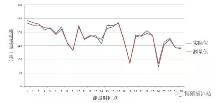 輸出重量信息,測量結(jié)果準(zhǔn)確,避免了溫度、壓力、粉塵、架橋、塌陷等環(huán)境因素的影響。以下圖示為一定時間段內(nèi)(兩個月),粉料重量的實際值與測量值之間的對比曲線。
