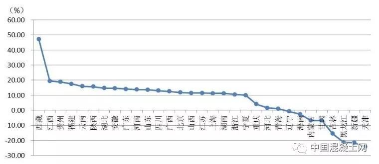 從各地區(qū)建筑業(yè)總產(chǎn)值增長情況看,有23個地區(qū)的建筑業(yè)總產(chǎn)值較上年同期有不同幅度的增長。其中,西藏、江西、貴州、福建、云南、陜西的增幅均超過15%。有8個地區(qū)出現(xiàn)負增長,其中,天津、新疆、黑龍江、吉林出現(xiàn)了15%以上的負增長(圖2)。