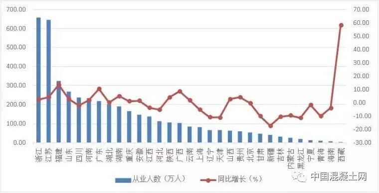 2018年上半年,全國建筑業(yè)從業(yè)人數(shù)超過百萬的地區(qū)共15個。浙江、江蘇依然是從業(yè)人數(shù)大省,人數(shù)分別達到658.04萬人和643.60萬人。福建、山東、四川、河南、廣東、湖北等6省從業(yè)人數(shù)均超過200萬人。與上年同期相比,16個地區(qū)的從業(yè)人數(shù)增加,其中,增加人數(shù)最多的是福建,增加38.15萬人;15個地區(qū)的從業(yè)人數(shù)減少,其中,減少最多的是新疆,減少8.76萬人。從業(yè)人數(shù)增幅最大的是西藏,達到58.09%;增幅最小的是新疆,下降了17.44%(圖5)。