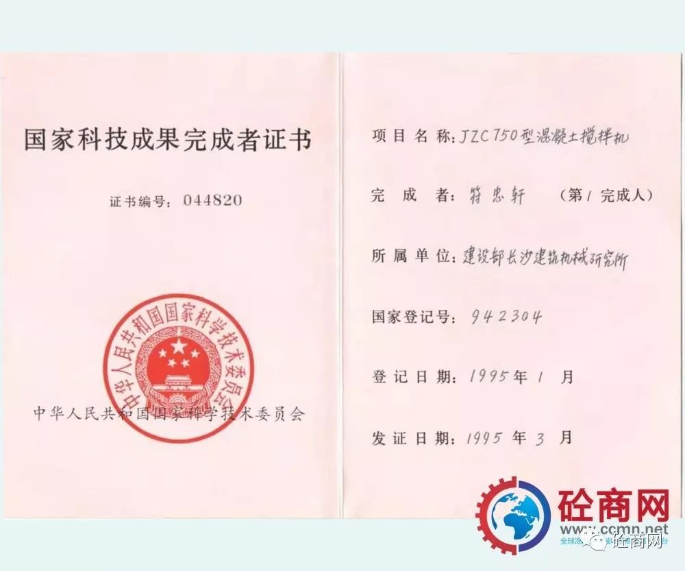 通過全行業(yè)的不懈努力,改革統(tǒng)型機(jī)型的結(jié)構(gòu)與技術(shù),新型混凝土攪拌機(jī)取得了突飛猛進(jìn)的發(fā)展,并在全國推廣使用,獲得用戶廣泛的認(rèn)可與好評。長沙建機(jī)院負(fù)責(zé)的、本人作為主要參與設(shè)計(jì)者的“JZ錐形反轉(zhuǎn)出料攪拌機(jī)系列”獲建設(shè)部1987年科技進(jìn)步二等獎;代表長沙建機(jī)所與方圓集團(tuán)合作開發(fā)的JZC750混凝土攪拌機(jī),獲得國家科技成果證書。