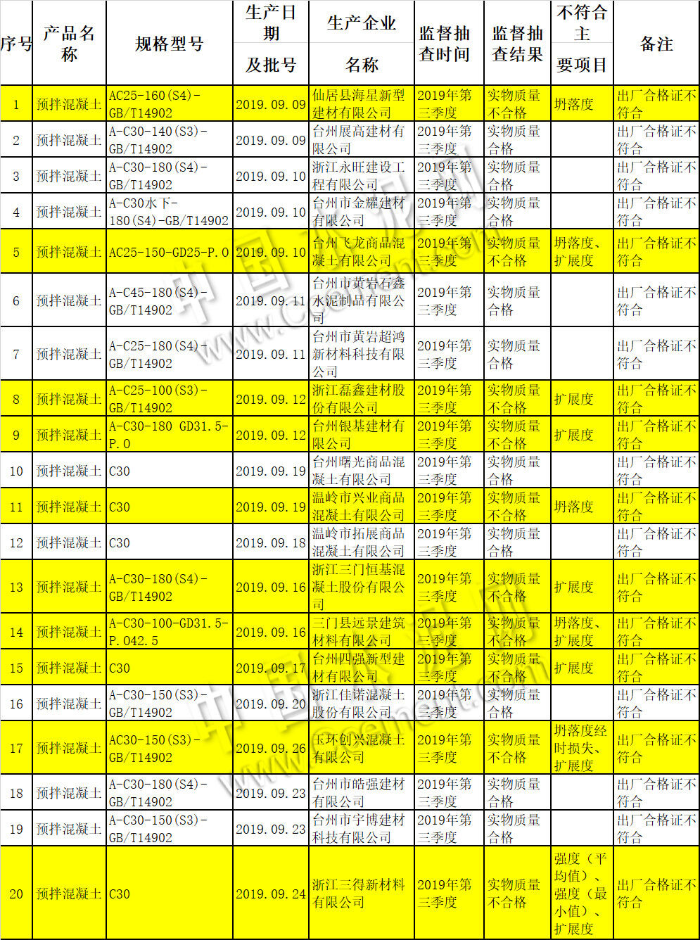 12月24日,臺州市市場監(jiān)督管理局官網(wǎng)發(fā)布2019年預(yù)拌混凝土產(chǎn)品質(zhì)量專項監(jiān)督抽查結(jié)果信息。近期,根據(jù)《中華人民共和國產(chǎn)品質(zhì)量法》、《浙江省產(chǎn)品質(zhì)量監(jiān)督條例》的規(guī)定,臺州市市場監(jiān)督管理局組織開展了2019年臺州市預(yù)拌混凝土產(chǎn)品質(zhì)量專項監(jiān)督抽查,涉及到臺州市有20家企業(yè)的20批次產(chǎn)品,其中實物質(zhì)量不合格10批次,實物質(zhì)量不合格率為50%。主要不符合項目為:強(qiáng)度、坍落度、坍落度經(jīng)時損失、擴(kuò)展度。本次專項監(jiān)督抽查發(fā)現(xiàn)合格證普遍存在不符合現(xiàn)象。