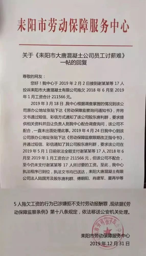 關(guān)于“耒陽市大唐混凝土公司員工討薪難”一貼的回復(fù)