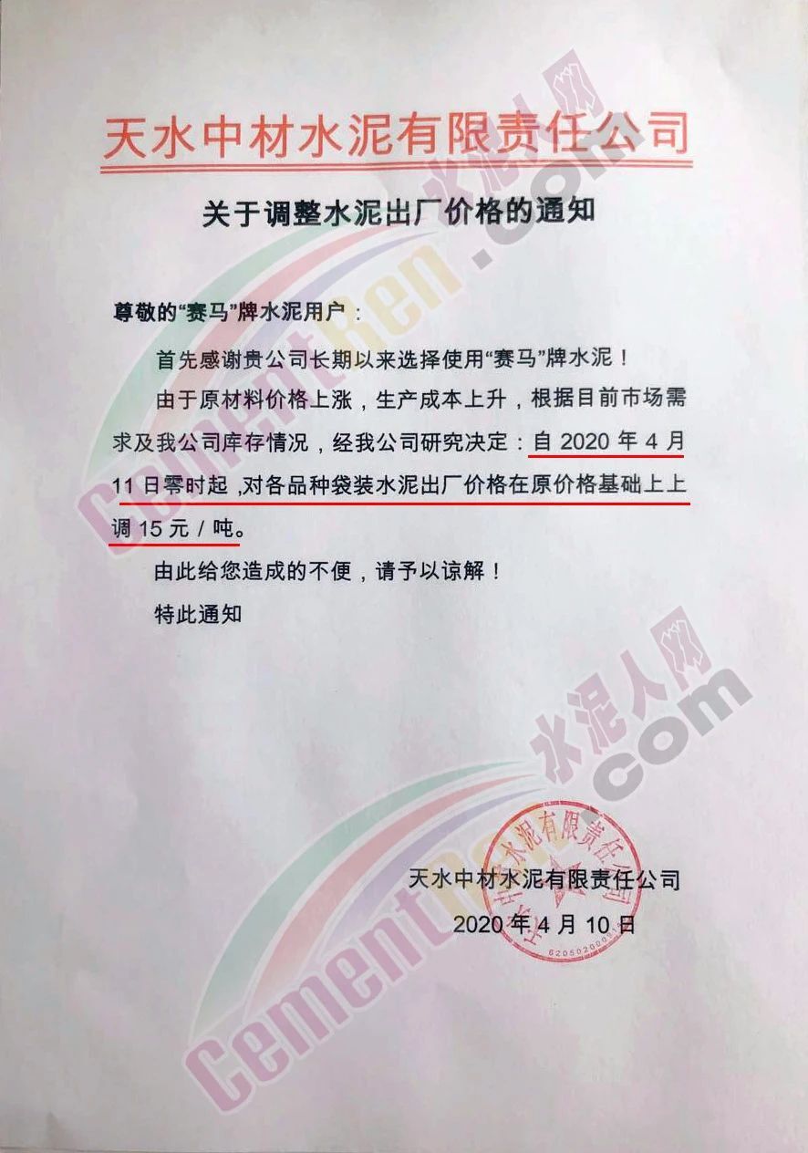昨日(4月10日)天水中材水泥有限責(zé)任公司通知,由于原材料價(jià)格上漲,生產(chǎn)成本上升,根據(jù)目前市場需求公及公司庫存情況 ,經(jīng)公司研究決定自今日(4月11日)零時(shí)起,對(duì)各品種袋裝水泥出廠價(jià)格在原價(jià)格基礎(chǔ)上上調(diào)15元/噸。