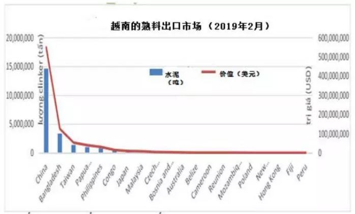 2019年,中國大陸是越南熟料水泥的主要市場占其市場份額的40.46%,達到631萬噸,價值248.19百萬美元。