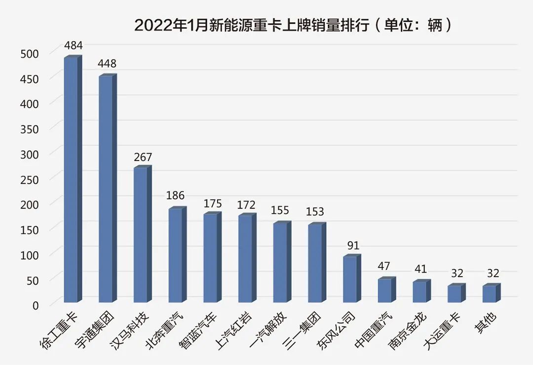 特別是在企業(yè)銷量排行榜上,表現(xiàn)最為搶眼的并不是傳統(tǒng)重卡制造商,而是工程機(jī)械企業(yè)跨行業(yè)進(jìn)軍重卡行業(yè)的典型代表——三一汽車與徐工汽車:三一新能源重卡2021年累計(jì)銷量達(dá)到1497輛,同比大增1621%,市場(chǎng)份額達(dá)到14.33%,較上年同期提升了11個(gè)百分點(diǎn);徐工在2022年1月21.2%的月度占有率火熱開局,問鼎新能源重卡2022首月銷冠。