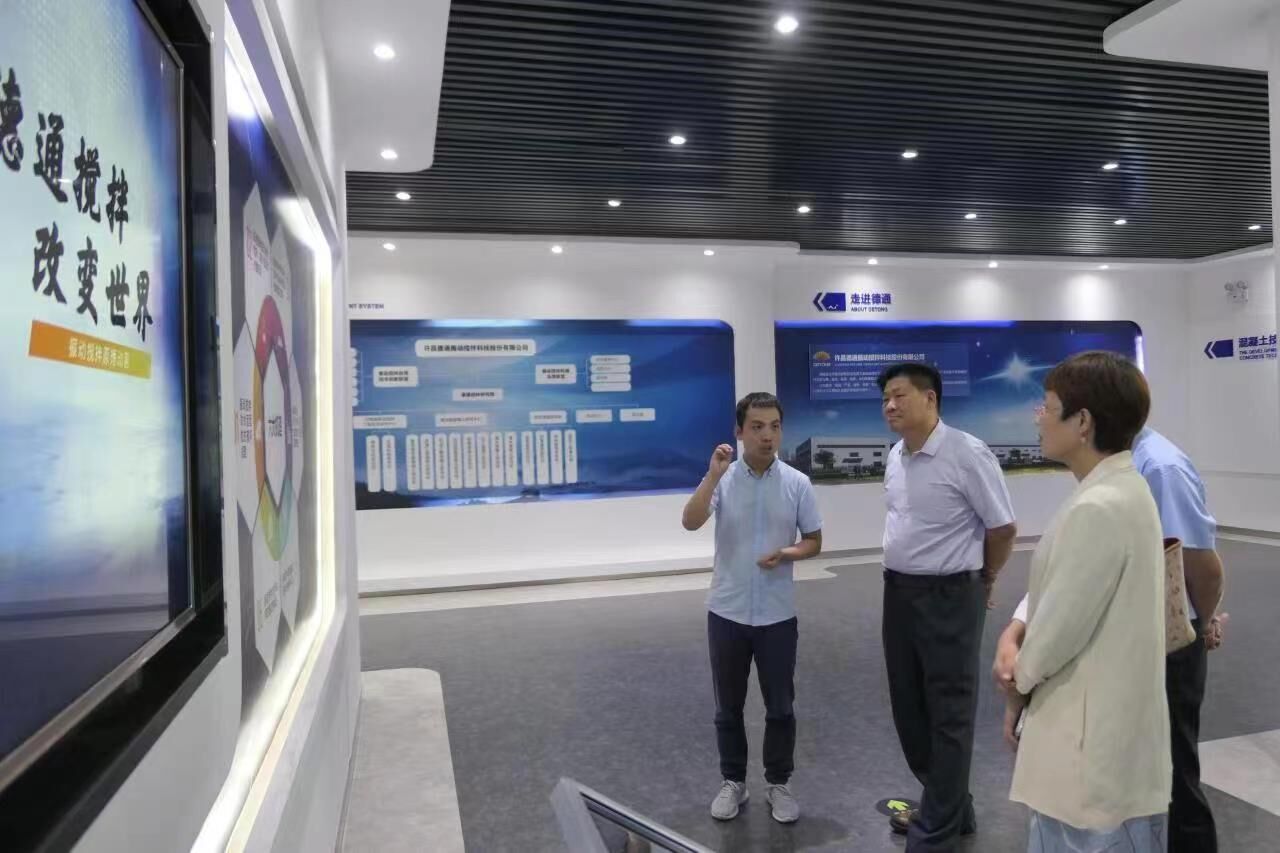 公司副總經(jīng)理孔鮮寧等陪同符忠軒會(huì)長(zhǎng)一行參觀德通多媒體展廳,匯報(bào)振動(dòng)攪拌技術(shù)研發(fā)及應(yīng)用成果。