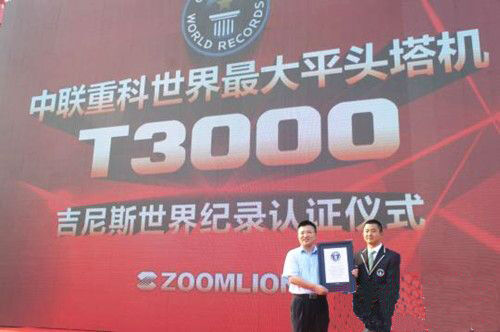 在交付儀式現(xiàn)場,英國吉尼斯世界紀錄認證官陳東先生鄭重宣布,T3000是全球最大的平頭塔機,由中國的中聯(lián)重科制造,再次創(chuàng)造了全球起重機械的又一個“世界之最”?!霸擁椨涗浀恼Q生標志著中聯(lián)重科塔機技術站在了世界塔機設計和制造領域的最前沿,充分彰顯了中聯(lián)重科在全球起重機行業(yè)的領先地位和主導作用”,國家建筑城建機械質(zhì)量監(jiān)督檢驗中心主任曾舜安表示。