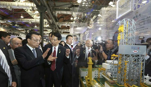 當(dāng)?shù)貢r間20日,李克強(qiáng)在里約熱內(nèi)盧州州長佩藏和巴西外長維埃拉的陪同下來到里約民港碼頭,參觀正在這里舉辦的中國裝備制造業(yè)展覽,并為展覽開幕剪彩。展覽包括鐵路及軌道交通、電力、通信、金融等10個板塊,代表國內(nèi)裝備制造業(yè)最高水平的30家中國企業(yè)參展。