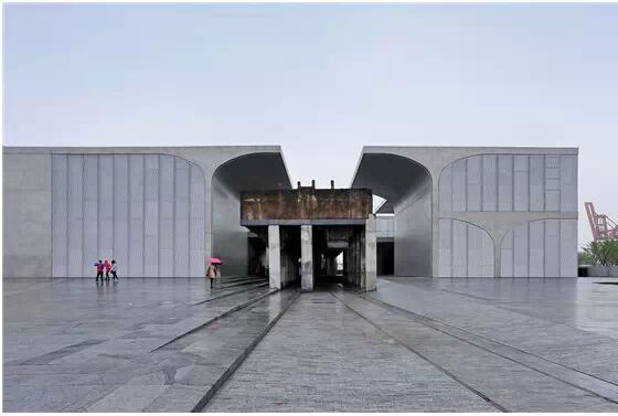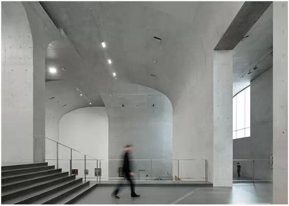 在“傘拱”結(jié)構(gòu)的空腔里,地面以上的“傘拱”覆蓋空間,墻體和天花均為清水混凝土的表面,它們的幾何分界位置也變得模糊。這樣的結(jié)構(gòu)性空間,在形態(tài)上不僅對(duì)人的身體形成庇護(hù)感,亦與保留的江邊碼頭的煤料斗產(chǎn)生視覺呼應(yīng)。建筑的內(nèi)部空間也得以呈現(xiàn)一種原始的野性魅力,而有著大小調(diào)節(jié)的空間尺度以及留有模板拼縫和螺栓孔的清水混凝土表面又會(huì)帶來一種現(xiàn)實(shí)感。這種“直白”式的結(jié)構(gòu)、材料、空間所形成的直接性與樸素性,加上大尺度出挑所產(chǎn)生的力量感或輕盈感,使整個(gè)建筑與原有場(chǎng)地的工業(yè)特質(zhì)間取得一種時(shí)間與空間的接續(xù)關(guān)系。地面以上的清水混凝土“傘拱”下的流動(dòng)展覽空間和地下一層傳統(tǒng)“白盒子”式的展覽空間由一個(gè)呈螺旋回轉(zhuǎn)、層層跌落的階梯空間聯(lián)接,既原始又現(xiàn)實(shí)的空間和古代、近代、現(xiàn)代直到當(dāng)代藝術(shù)的展覽陳列,這種并置的張力,呈現(xiàn)出一種具有時(shí)間性的展覽空間。