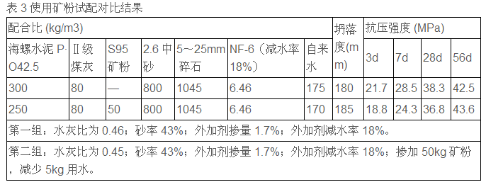 磨細(xì)礦粉能延緩膠凝材料的水化速度,延長凝結(jié)時間,尤其在炎熱的夏季及大體積混凝土應(yīng)用中有明顯效果。另外礦粉具有改善混凝土工作性,改善混凝土的內(nèi)部結(jié)構(gòu),提高抗?jié)B和抗腐蝕的能力,這些都有大量試驗證明。因為水泥與礦粉存在部分差價,利用礦粉后期增強效果,既可以降低水化熱,減少裂縫的產(chǎn)生,又可以使混凝土后期強度不變或更高。如表3。