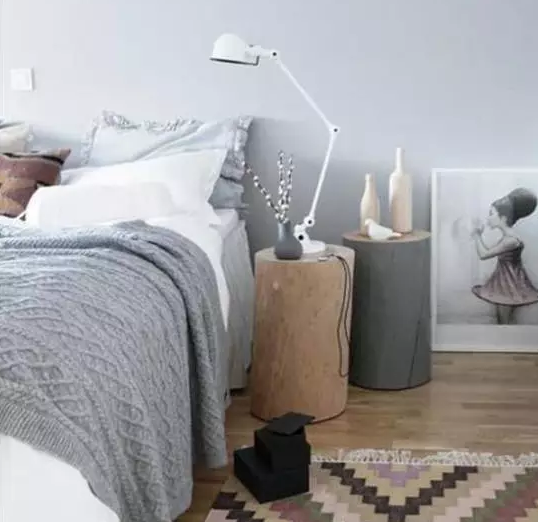 床頭柜選擇了兩個木墩,在家里頗有原木的氣息,舍棄了床頭板的設(shè)計,沒有一絲繁縟的感覺,翻來覆去更加自在。