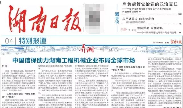 近日,《湖南日報》專版刊登了宣傳報道《中國信保助力湖南工程機(jī)械企業(yè)布局全球市場》。報道肯定了中國信保在履行政策性職能方面取得的成效,并介紹了中國信保長沙營管部在支持湖南省工程機(jī)械行業(yè)企業(yè)更好地“走出去”所采取的措施。報道詳情如下: