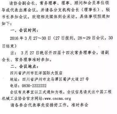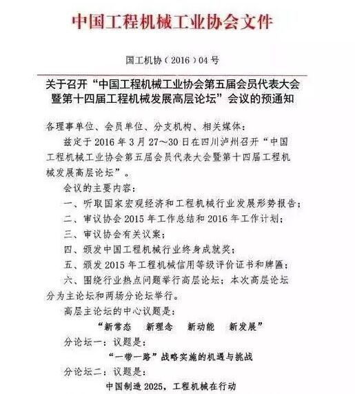 中國(guó)工程機(jī)械工業(yè)協(xié)會(huì)第五屆會(huì)員代表大會(huì)暨第十四屆工程機(jī)械發(fā)展高層論壇茲定于2016年3月27日~30日在四川瀘州召開。