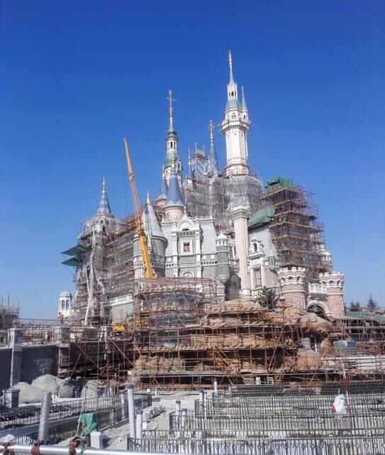近日,筆者在上海迪士尼項目現(xiàn)場看到,項目的主體工程已經(jīng)呈現(xiàn)效果,迪士尼城堡等主體建筑呈現(xiàn)出童話般的色彩。圖中坐落于園區(qū)中央正在施工的就是白雪公主住的“奇幻童話城堡”,而它不僅是上海迪士尼樂園中的最高建筑,還是世界上最高、最大、最具互動性的迪士尼城堡