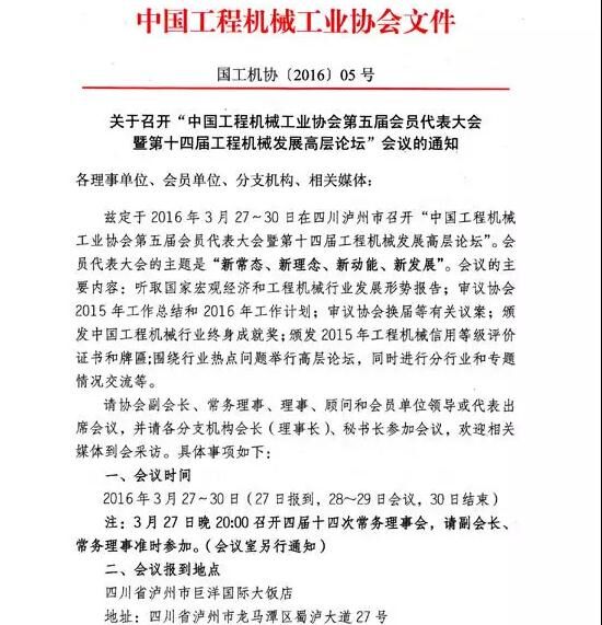 茲定于2016年3月27~30日在四川瀘州市召開“中國工程機(jī)械工業(yè)協(xié)會第五屆會員代表大會暨第十四屆工程機(jī)械發(fā)展高層論壇”。會員代表大會的主題是“新常態(tài)、新理念、新動能、新發(fā)展”。會議的主要內(nèi)容:聽取國家宏觀經(jīng)濟(jì)和工程機(jī)械行業(yè)發(fā)展形勢報(bào)告;審議協(xié)會2015年工作總結(jié)和2016年工作計(jì)劃;審議協(xié)會換屆等有關(guān)議案;頒發(fā)中國工程機(jī)械行業(yè)終身成就獎;頒發(fā)2015年工程機(jī)械信用等級評價(jià)證書和牌匾;圍繞行業(yè)熱點(diǎn)問題舉行高層論壇,同時(shí)進(jìn)行分行業(yè)和專題情況交流等。