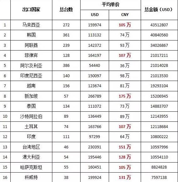 2015年1—11月我國塔機出口3098臺,同比減少14.68%,出口金額達到39303.24萬美元,同比減少6.95%,預計全年出口3300臺左右,相比國內(nèi)市場接近50%的銷量跌幅,塔機出口成績可嘉。尤其2015年上半年相比去年同期增長了16.7%,但從7月份開始逐月走低。從近10年的區(qū)域占比來看,中國塔機出口的市場一直由亞太地區(qū)市場占據(jù)絕對主力,從近三年的數(shù)據(jù)可以看出,雖然歷年各國排名都有變化,但除了俄羅斯聯(lián)邦、土耳其、巴西、阿爾及利亞等國家外,其他列于榜單中的國家全部位于亞洲區(qū)域,顯而易見,我國塔機出口主要市場依舊是亞洲等發(fā)展中國家。(具體參見下圖:2015年1—11月塔機出口數(shù)據(jù))