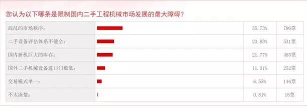 工程機械區(qū)別于其他行業(yè)一個重要的地方是,二手商品的回收利用尤為重要,因為一個機械的生命周期相對于快消品來說更長,所以在二手商品的回收、租賃同樣存在巨大機會。但是該行業(yè)目前發(fā)展前景不明朗。在慧聰工程機械網(wǎng)的一項“限制二手工程機械市場發(fā)展的最大障礙”的投票中,“混亂的市場秩序”得票最高,796票,“二手設(shè)備評估體系不健全”排名第二,得票531,“國內(nèi)新機的巨大庫存”排名第三,得票485。