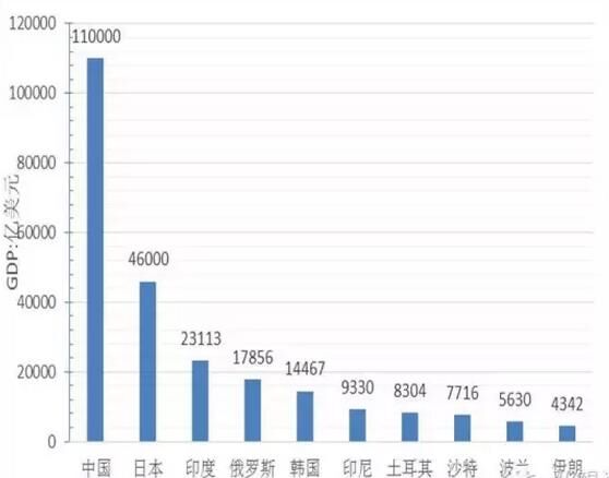 從經(jīng)濟總量看,GDP超過1萬億美元的國家5個,分別為中國、日本、印度、俄羅斯、韓國,其中中國經(jīng)濟總量為11萬億美元、位居第一、為最小國家不丹的5800倍,約占“一帶一路”地區(qū)經(jīng)濟總量的40%;GDP在5000億到1萬美元的國家4個,分別是印尼、土耳其、沙特、波蘭;GDP在1000億到5000億美元的國家19個,GDP在100億到1000億美元的國家30個;低于100億元美元的國家8個,分別為塔吉克斯坦、蒙古、吉爾吉斯坦、摩爾多瓦、巴勒斯坦、黑山、馬爾代夫、不丹,其中經(jīng)濟規(guī)模最小為不丹、GDP為19億美元。
