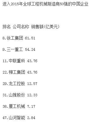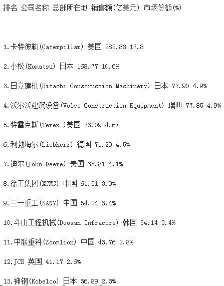 分析指出,受大宗商品價格下跌、新型經(jīng)濟體經(jīng)濟增速減緩和世界經(jīng)濟不景氣的影響,全球前50家工程機械制造企業(yè)總產(chǎn)值較上一年度下跌16.2%,達到1330億美元,創(chuàng)2009年以來新低。據(jù)中國工程機械商貿(mào)網(wǎng)編輯了解,2009年,工程機械行業(yè)一年銷售額下降了1090億美元。自那時起,工程機械行業(yè)收入下降趨勢一直未有改變。報告同時強調(diào),榜單上下滑最為嚴重的是中國企業(yè),這很大程度上是因為中國經(jīng)濟增速的放緩。中國企業(yè)中,只有徐工集團仍然保持在前十強,位列榜單第九位?!斑@個市場趨勢表現(xiàn)最顯著的就是中國建筑設(shè)備制造商,相比去年,所有中國企業(yè)的排名有所下滑。排名前十的企業(yè)中,如今只有徐工一家中國工程機械制造廠商?!?/span>