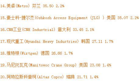 從表單中不難看出,卡特彼勒、小松的世界排名相對穩(wěn)定,仍然位居第一、第二名。其中卡特彼勒占總市場收入的18.1%。較之2015年,特雷克斯上升兩個名次,位居第三位。特雷克斯取代日立排名第三,日立建機排名第四,利勃海爾位列第五,沃爾沃排名第六。除此之外,斗山和杰西博分別上升兩個名次,擠進前十名。