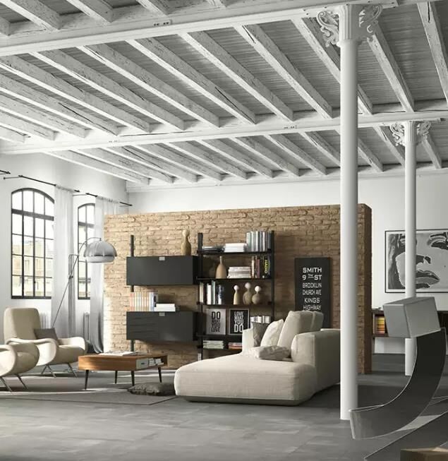 水泥灰的瓷磚,白色吊頂及墻面,營造出一種略微冰涼不近人情的工業(yè)氛圍,空闊粗糙的設(shè)計感,組成一個有著極大吸引力的家居風格。
