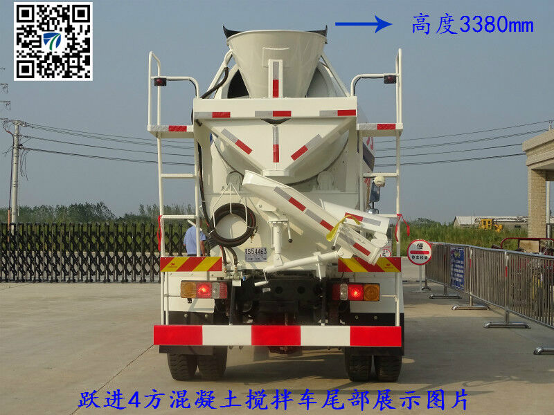 依維柯躍進開拓4方-5方混凝土攪拌車介紹:單排白色駕駛室,發(fā)動機玉柴130馬力發(fā)動機,145前后橋,8.25-20尼龍?zhí)ィ?小八檔帶高低檔、軸距3300mm。