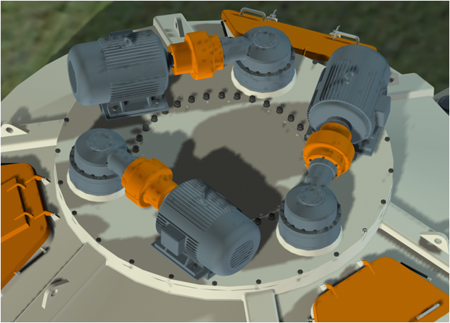 ④對于大型立軸行星式攪拌主機(jī),我們采用多電機(jī)驅(qū)動,其起動平穩(wěn)、可靠性高。獨(dú)特的電機(jī)臥式安裝結(jié)構(gòu),有效降低了攪拌主機(jī)的整體高度,方便運(yùn)輸和安裝及攪拌主機(jī)進(jìn)料系統(tǒng)布局,維修更加簡便,該主機(jī)結(jié)構(gòu)設(shè)計(jì)我公司已獲專利。