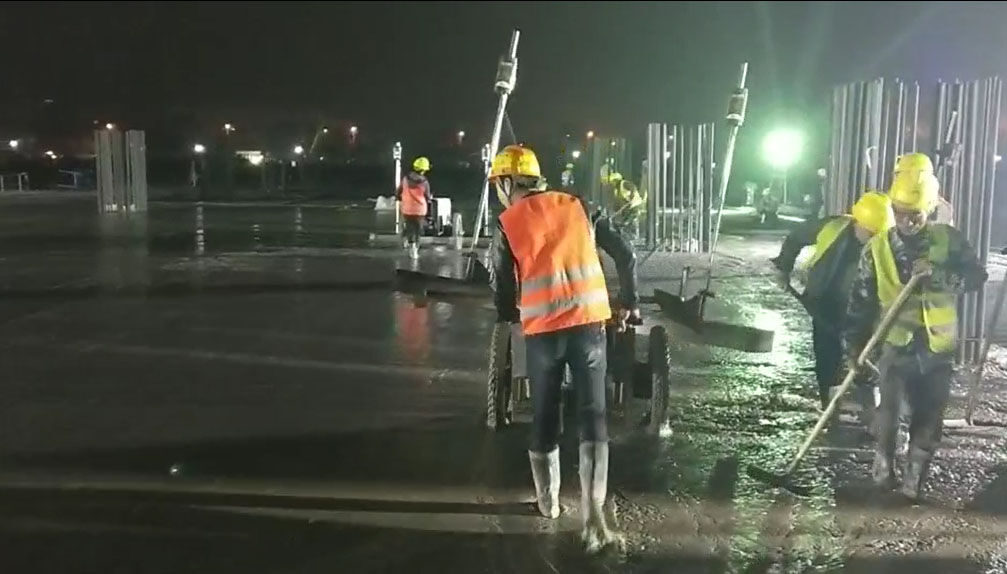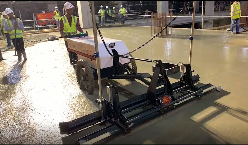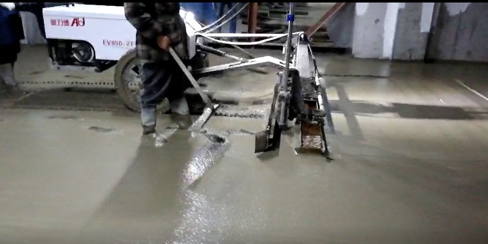 混凝土激光攤鋪機是用刮板將高出的混凝土帶走并初步刮平,達到設計要求的標高。液壓驅動振動馬達產(chǎn)生震動,頻率為4000次/分鐘,帶動整個振動板一起對混凝土產(chǎn)生振搗。激光攤鋪機找平不需要拉控制線,也不需要支側模板來控制地面標高,而由攤鋪機上的激光測控系統(tǒng)實時控制,只要激光發(fā)射器不受干擾,無論攤鋪機移動到哪里,都能確保鋪筑后的地面整體上的標高不受影響。