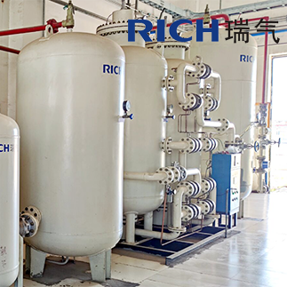 瑞氣所生產(chǎn)的制氮機(jī)采用變壓吸附技術(shù),以空氣為原料制取氮?dú)?。變壓吸附制氮技術(shù),一般采用PSA碳分子篩為吸附劑,碳分子篩對(duì)氧氮的吸附速度相差很大,在短時(shí)間內(nèi)加壓情況下,氧的吸附速度大大超過(guò)氮的吸附速度,氧分子被碳分子篩大量吸附,而氮分子吸附很少,利用該特性來(lái)完成氧氮分離。碳分子篩對(duì)氧的吸附容量隨壓力的降低而減少,減低壓力,被吸附的氧分子則從碳分子篩中逸出,通過(guò)塔的下部進(jìn)入消音器后排出大氣,即可解吸,完成碳分子篩的再生。另外,碳分子篩對(duì)二氧化碳和水分也有吸附能力,且較易減壓解吸。通常PSA制氮機(jī)采用雙吸附并聯(lián)交替進(jìn)行吸附產(chǎn)氮,解吸再生,實(shí)現(xiàn)氧、氮分離,連續(xù)供氣。
