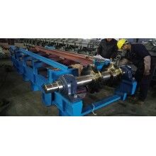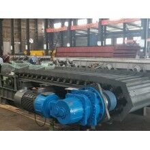 通過分析研究上述問題,結合國內(nèi)外給料機使用情況,重新設計制作了一臺新型給料機,主要特點是:采用板式給料機連續(xù)給料;板式給料機料板采用雙圓弧、節(jié)點重合的方式,解決了漏料問題;板式給料機安裝角度為18°,可使物料緩慢分散跌落到皮帶機上;撥料棍采用逆物料方向旋轉(zhuǎn),以控制物料層的厚度;料斗設計采用漸開式,解決了膨料問題;電機采用變頻控制,可控制出料速度。經(jīng)過三個多月的的現(xiàn)場使用,證明能夠完成勻料,效果較好。