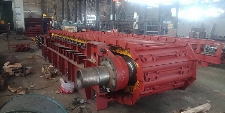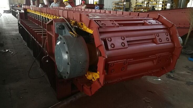 鏈板組件直接承受礦倉物料壓力和運送物料。鏈板組件由輸送板、牽引鏈軌及其聯(lián)接螺栓組成。輸送板采用搭接式結構。輸送板材質為高錳鋼,鑄造成型,相互搭接,輸送板用螺栓固定在鏈軌上。這種板不僅重量輕、不漏礦,而且強度高、耐磨損、抗沖擊。
