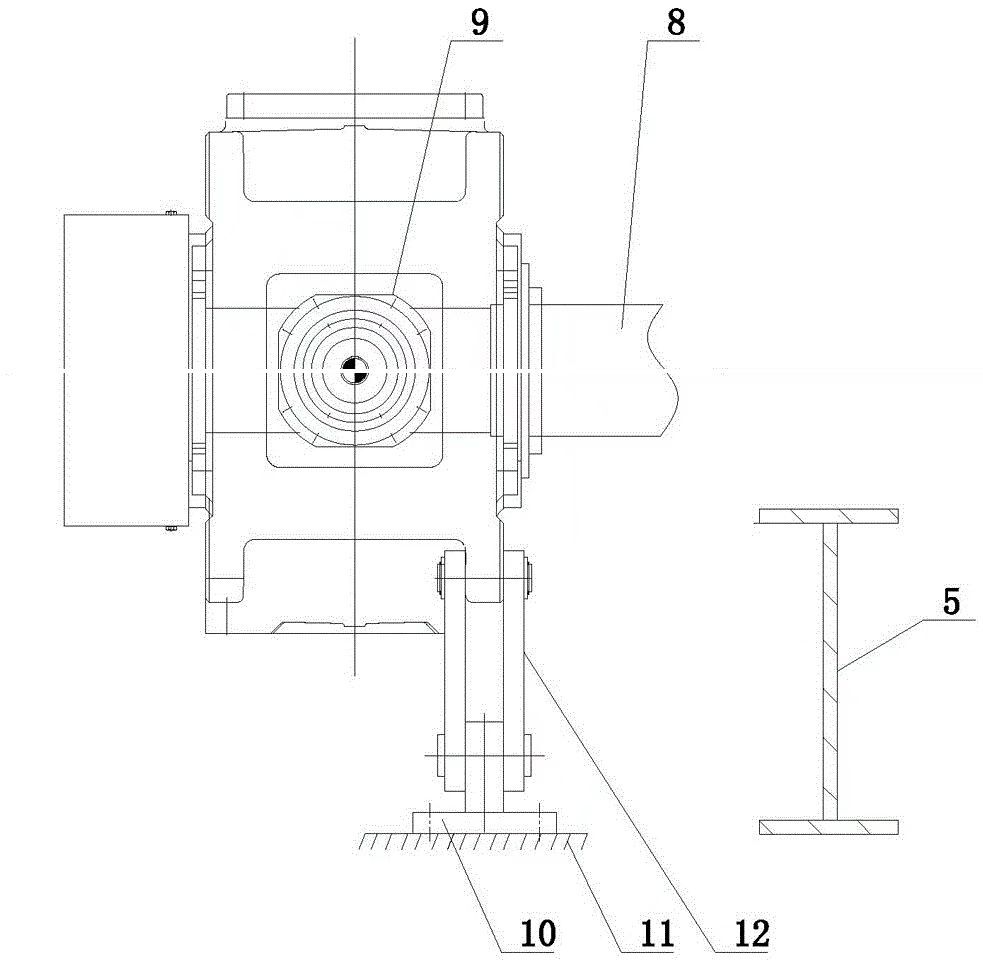 現(xiàn)有的重型板式給料機(jī)驅(qū)動(dòng)機(jī)構(gòu)結(jié)構(gòu)如圖2所示,包括驅(qū)動(dòng)機(jī)構(gòu)9,驅(qū)動(dòng)機(jī)構(gòu)9下端設(shè)置扭力臂12,扭力臂12下端設(shè)置有連接座10,連接座10與地基11相連;其驅(qū)動(dòng)機(jī)構(gòu)9與重板主體5之間不相連。由于重型板式給料機(jī)工況惡劣、振動(dòng)較大,驅(qū)動(dòng)機(jī)構(gòu)9單獨(dú)與地基11相連,造成驅(qū)動(dòng)機(jī)構(gòu)9的震動(dòng)與主機(jī)的震動(dòng)不同步,因此,這種不同步的震動(dòng)對(duì)鏈輪軸8傷害較大,嚴(yán)重時(shí)可導(dǎo)致鏈輪軸8斷裂。