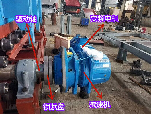 3)采用變頻調(diào)速電動(dòng)機(jī)通過(guò)彈性柱銷(xiāo)聯(lián)軸器與軸裝式減速機(jī)直聯(lián),主傳動(dòng)軸直接串在減速機(jī)的空心輸出軸內(nèi),通過(guò)鎖緊盤(pán)(漲套)聯(lián)接。由于減速機(jī)采用懸掛軸裝式結(jié)構(gòu),傳動(dòng)裝置整體為懸掛式,安裝就位時(shí)可將減速機(jī)支架與主機(jī)機(jī)架簡(jiǎn)易連接或在減速機(jī)支架下設(shè)置簡(jiǎn)易力臂式支座與地面連接,支座根據(jù)現(xiàn)場(chǎng)條件制作。