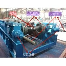 拉緊裝置是一種螺旋絲桿拉緊結(jié)構(gòu),功用是將槽板拉緊,使之具備預(yù)定好的的預(yù)緊張力。它是由拉緊軸、鏈輪、定位套、可以滑動的軸承座、絲桿、緊固螺母等部件組成。軸承座裝在機(jī)架兩側(cè),并在滑板之間前后滑動。拉緊裝置用來拉緊和調(diào)解鏈條的水平位置,保證松緊適度,使其安穩(wěn)運(yùn)載,經(jīng)由拉緊螺桿拉緊,使兩側(cè)鏈條的拉力趨于勻稱,當(dāng)鏈板突然經(jīng)受物料的沖撞時,復(fù)合拉緊彈簧可以起緩沖功用,保護(hù)槽板和其余各部件免受損壞。