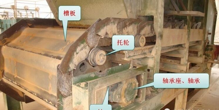 電機(或液壓馬達)的動力通過連軸器、減速機等部件驅動鏈輪轉動,鏈輪帶動輸送鏈條和鏈板一起向前運動,此時堆積在鏈板上的物料隨鏈板一起向前移動,在板式給料機的頭部卸下,實現(xiàn)連續(xù)給料。運轉時,輸送鏈的工作部分由上托輪支承,回程鏈板則有下托輪支承。