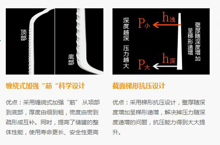 1)產(chǎn)品采用韓國進口高質(zhì)量LLDPE作為產(chǎn)品生產(chǎn)原材料,生產(chǎn)出來的pe儲罐具有無毒、無味、耐酸、耐堿、耐沖擊、耐高溫、耐寒、不易老化等優(yōu)點。