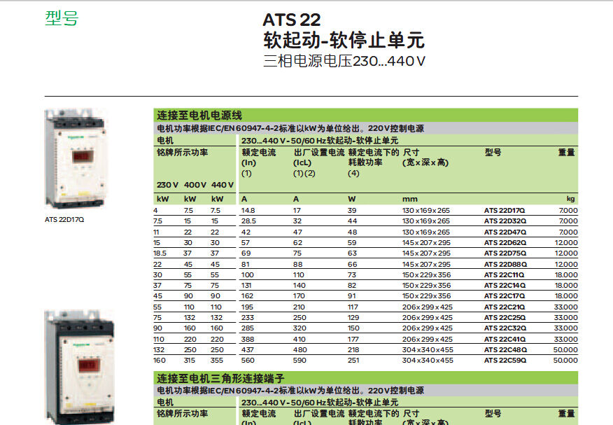 ATS 22軟起動-軟停止單元通過電壓和轉矩, 對額定功率在4至400 kW范圍內的三相鼠