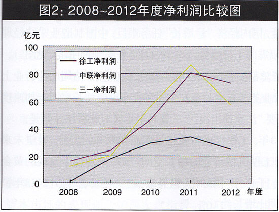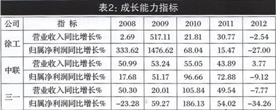 公司的成長與盈利能力正相關。在年報中,主營業(yè)務收入增長率、凈利潤增長率、凈資產(chǎn)增長率以及凈資產(chǎn)收益率、毛利率、凈利率等財務指標,是判斷企業(yè)成長性和盈利能力的重要指標。表2顯示,三駕馬車中,5年主營業(yè)務收入同比增長率實現(xiàn)連續(xù)5年正增長、連續(xù)三年保持30%以上增長率的公司是中聯(lián),五年中增長率振幅最大的公司是徐工,2012年徐工和三—主營業(yè)務收入增長率均出現(xiàn)負增長;表2還顯示,凈利潤同比增長率方面,沒有—家公司連續(xù)五年正增長,2012年三駕馬車同時出現(xiàn)負增長,三一錄得-34.26%的最大降幅。在大環(huán)境不利因素作用下,公司成長性受到嚴峻挑戰(zhàn)(見圖2)。