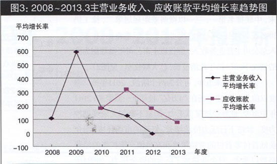 圖3 2008~2013.3主營業(yè)務收入、應收賬款平均增長率趨勢圖