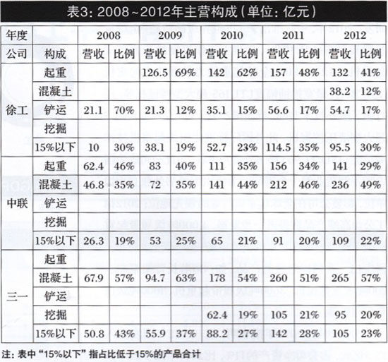分析表3數(shù)據(jù),2012年營業(yè)收入超100億元的產(chǎn)品:徐工是起重機,營收132億元、占到營業(yè)總收入4l%,其中占營業(yè)收入15%以上的產(chǎn)品還有鏟運機械,占比17%、營收54.7億元;中聯(lián)有兩個營收超百億元產(chǎn)品,分別是營收236億元的混凝土機械和141億元的起重機械。占比分別是46%和34%,二者合計占比80%;三一近似有兩個超百億元產(chǎn)品,一個是營收265億元的混凝土機械和約百億元營收95億元的挖掘機械,分別占比57%和20%,二者合計占比77%?;赝?008年,三駕馬車沒有一個產(chǎn)品營收超百億元,其占比15%以上的產(chǎn)品:徐工是鏟運機械,營收21.1億元、占比70%;中聯(lián)是起重機械、混凝土機械,占比分別是46%、35%,二者合計占比81%;三一是混凝土機械,占比57%。細分產(chǎn)品構成,徐工的起重機主要以移動式起重機為主,在行業(yè)處于龍頭地位;中聯(lián)的起重機包含移動和塔式兩塊,其中塔式起重機是行業(yè)龍頭;在占比小于15%的部分,徐工有混凝土機械、壓實機械、路面機械等,中聯(lián)有土方機械、路面及樁工機械、環(huán)衛(wèi)機械等,三一有起重機械、路面及樁工機械等。