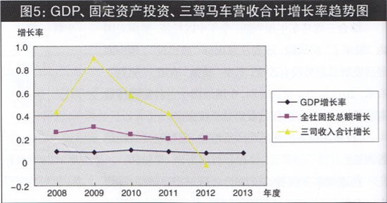 周期性行業(yè)受周期制約的特點,決定周期性行業(yè)要避免誤判宏觀經(jīng)濟發(fā)展趨勢,才能健康發(fā)展。5年來,三駕馬車—直在擴張產(chǎn)能,在經(jīng)濟下行壓力加大、GDP增長率持續(xù)回落的宏觀背景下,主要財務指標必然加速度回落(見圖4)。面對如此局面,要保持增長勢頭,就必須準確判斷宏觀經(jīng)濟趨勢,調(diào)整企業(yè)發(fā)展戰(zhàn)略。三駕馬車,是如何判斷宏觀經(jīng)濟發(fā)展趨勢的呢?